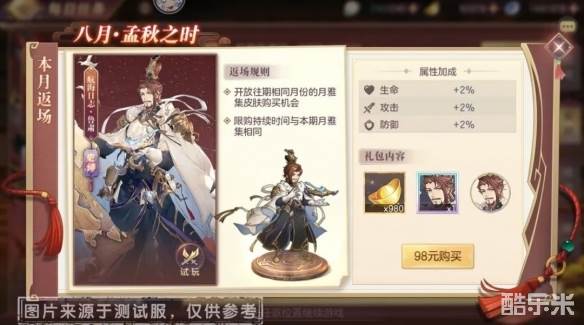 3、载入月雅集的皮肤品质为:史诗。载入月雅集后短期内不会通过其它途径进行贩售,且未来返场将恢复原价:98元。