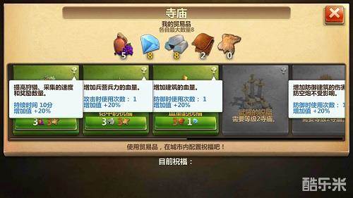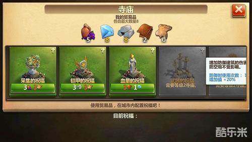 采集时间短,往往在集合了果树、金矿、和大型动物时使用,能够最快速的获取金币和粮食资源,带来文明的快速发展。而铠甲则主要用于联机作战或者全面战争玩法,让资源掠夺更加便利。血量的祝福则是全面战争和玩家下线休息必备的,防止城镇被有效的攻击掠夺。