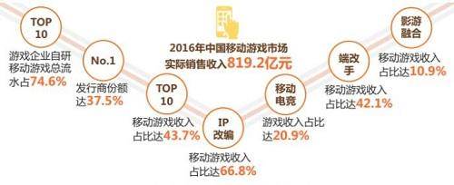 根据《2016年移动游戏产业报告》指出,2016,中国移动游戏市场实际销售收入为819.2亿元,同比增长59.2%。移动游戏市场成为整体游戏市场主要增长动力,并首次超越客户端游戏市场。