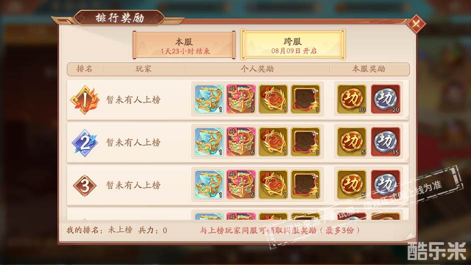 活动期间,通过充值、活跃、登录获得的军旗、军鼓、军号可招兵买马获得大量兵力,再根据兵力进行排名。排名分为本服排名以及跨服排名。