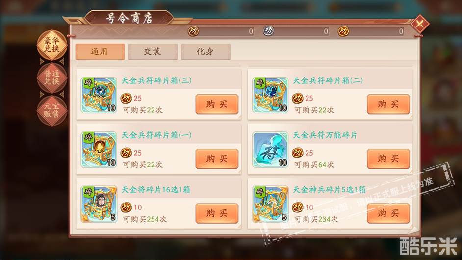 在通用商店中,可兑换天金兵符碎片箱(三)、天金兵符碎片箱(二)、天金兵符碎片箱(一)、天金兵符万能碎片、天金将碎片16选1箱、天金神兵碎片5选1箱、天金军师碎片5选1箱、天金神兽碎片4选1箱、天金装备碎片箱、赤金紫金资源、天幻羽毛碎片、赤炼羽毛碎片、幻冥羽毛碎片、苍穹幻赤石、星宿凝晶等珍稀奖励;