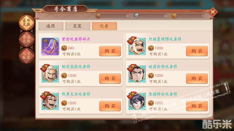 在化身商店中,还可兑换紫金化身符碎片、一至四代天金将化身符、赤金化身符,一定不要错过。