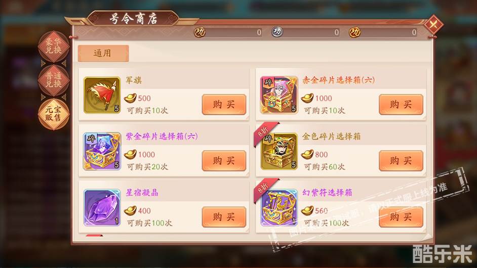 活动期间,少年们可以消耗元宝也可直接购买军旗、赤金碎片选择箱(六)、紫金碎片选择箱(六)、金色碎片选择箱、金命星选择箱(20选1)、星宿凝晶、幻紫符选择箱等稀有资源,此外还可以超低折扣购买银币,顶级精炼石,培养丹,神兵锻造石等实用资源,低至五折,不要错过哦~