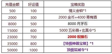 1、活动期间通过充值金币可获得好运值,好运值达到宝箱领取条件,即可打开宝箱领取其中奖励;