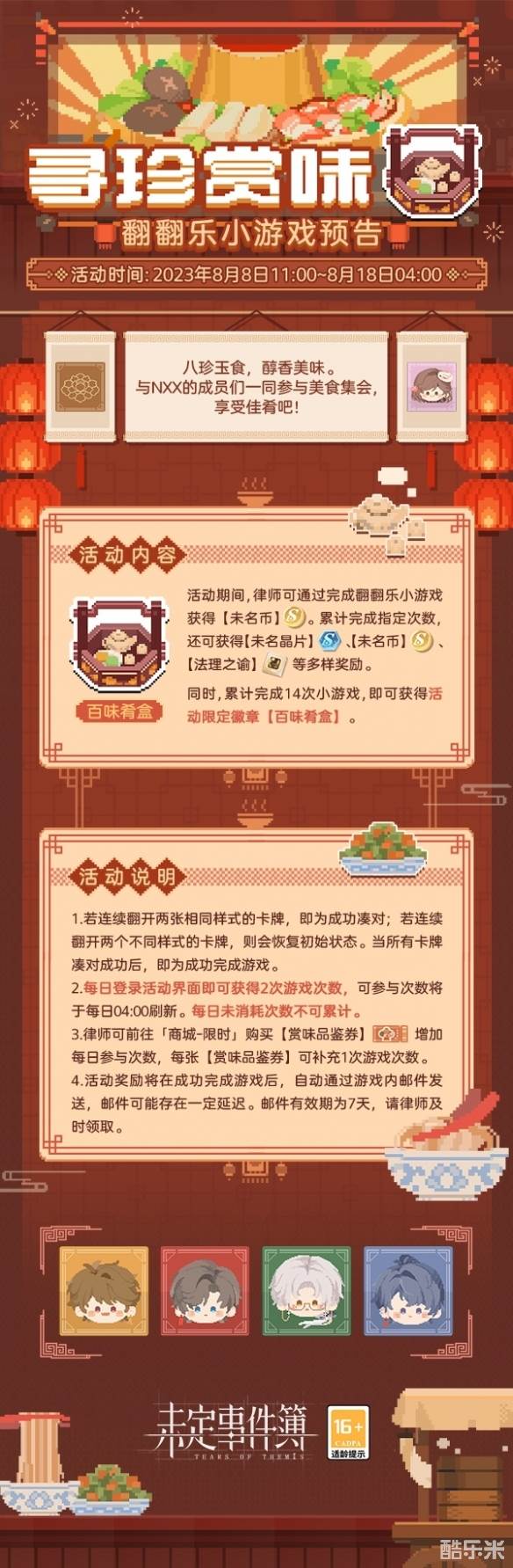 活动期间,律师可通过完成翻翻乐小游戏获得【未名币】。累计完成指定次数,还可获得【未名晶片】、【未名币】、【法理之谕】等多样奖励。同时,累计完成14次小游戏,即可获得活动限定徽章【百味肴盒】。