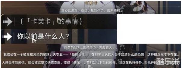 9.回去与卡芙卡对话,继续真心话游戏,卡芙卡问我们,我们问卡芙卡。个人的看法是,卡芙卡虽然一直强调命运不可改,但依旧给了我们可能性,按照一真一假的游戏规则,在卡芙卡应该不会骗我们的前提下,她的身世是没有问题的,也就是第一个问题是真的,那她说的命运是注定的,可能就是假的。
