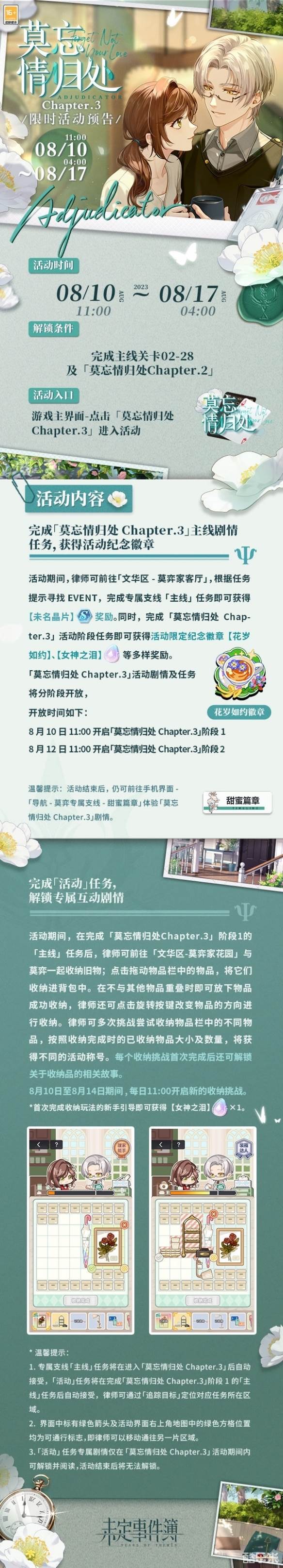 ※活动结束后,仍可前往手机界面-「导航-莫弈专属支线-甜蜜篇章」体验「莫忘情归处Chapter.3」剧情