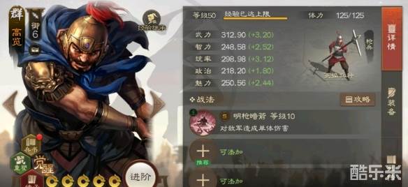 高览的属性中规中矩,属于五星橙将中比较一般的武将,自带兵种上虽然枪兵属于S级,可是却不是非常符合魏盾和魏骑的思路,最后的战法也比较一般,基本上到了后续的赛季中,35%的发动概率太看脸了,运气不好可能一次都用不出,上限和下限波动非常大,不符合主流阵容的思路。高览武将缘分战法——河间四将当高览和文丑,张郃,颜良中的两人组成阵容的时候,战斗开始后第3回合,使敌军群体进入虚弱状态(无法造成伤害),持续1回合。