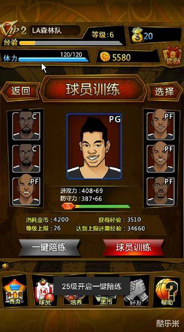 一键陪练功能到25就开启了,按一下就可以选6个球员哦。