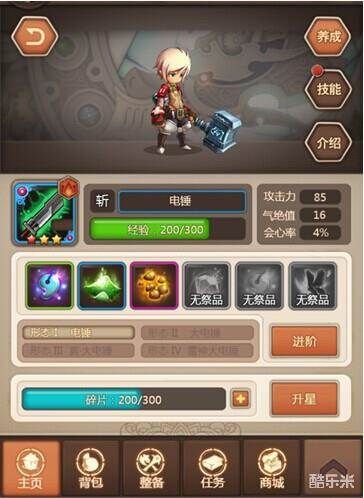 进入武器进阶界面后我发现。这个直给的锤子,竟然还可以进化到更高阶形态。目前所了解到信息是:集齐六件道具后可以让装备进阶。进阶成成功后,装备属性以及外观都有极大变化哦。通过官网君的小道消息,萤火酱发现锤子的第四形态真是狂炫叼霸天呀。