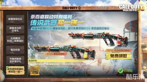 传说级武器买一送一活动同步开启,抽取传说级武器:BY15-爆裂泡泡机,获得后可以去活动中心兑换传说级武器:BY15-茶百道西瓜啵动!