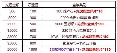 【活动内容】活动期间可通过充值金币获得好运值,积累好运值即可打开宝箱奖励,闪耀称号,全新神器,绝对超值的提升战力资源,尽在特惠好礼。