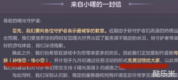 因为服务器波动厉害表示道歉的同时还紧急制作新皮肤免费回馈给玩家,如果王者荣耀的诚意能到这种程度还能有小曙什么事儿?可惜王者没有,反而是冷处理甚至接连上新皮肤,伤透了玩家的心。