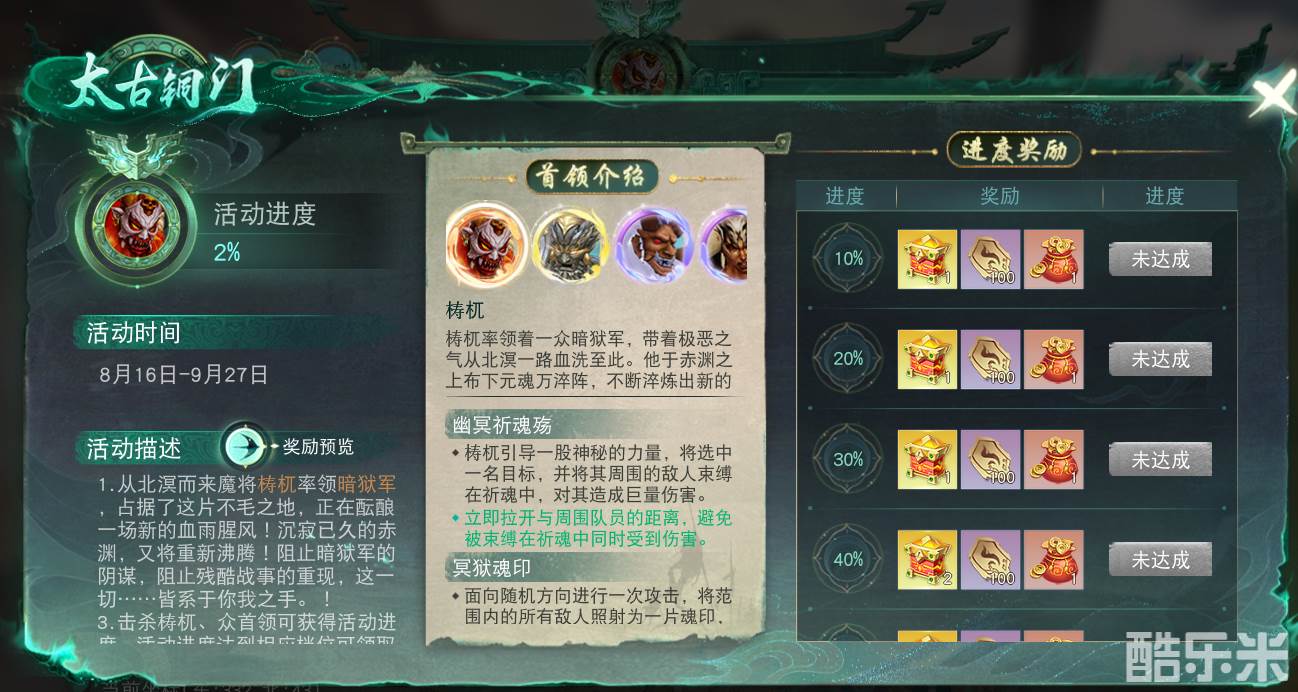 每周三、周六晚上20点,梼杌会出现在朔风漠-赤渊大肆屠戮,前往击退可获得全服活动进度,达到相应档位可获得金色魂晶等珍贵奖励;击退时梼杌血量越低获得的奖励越高,排名前列的少侠还能获得太古装备宝盒等奖励!