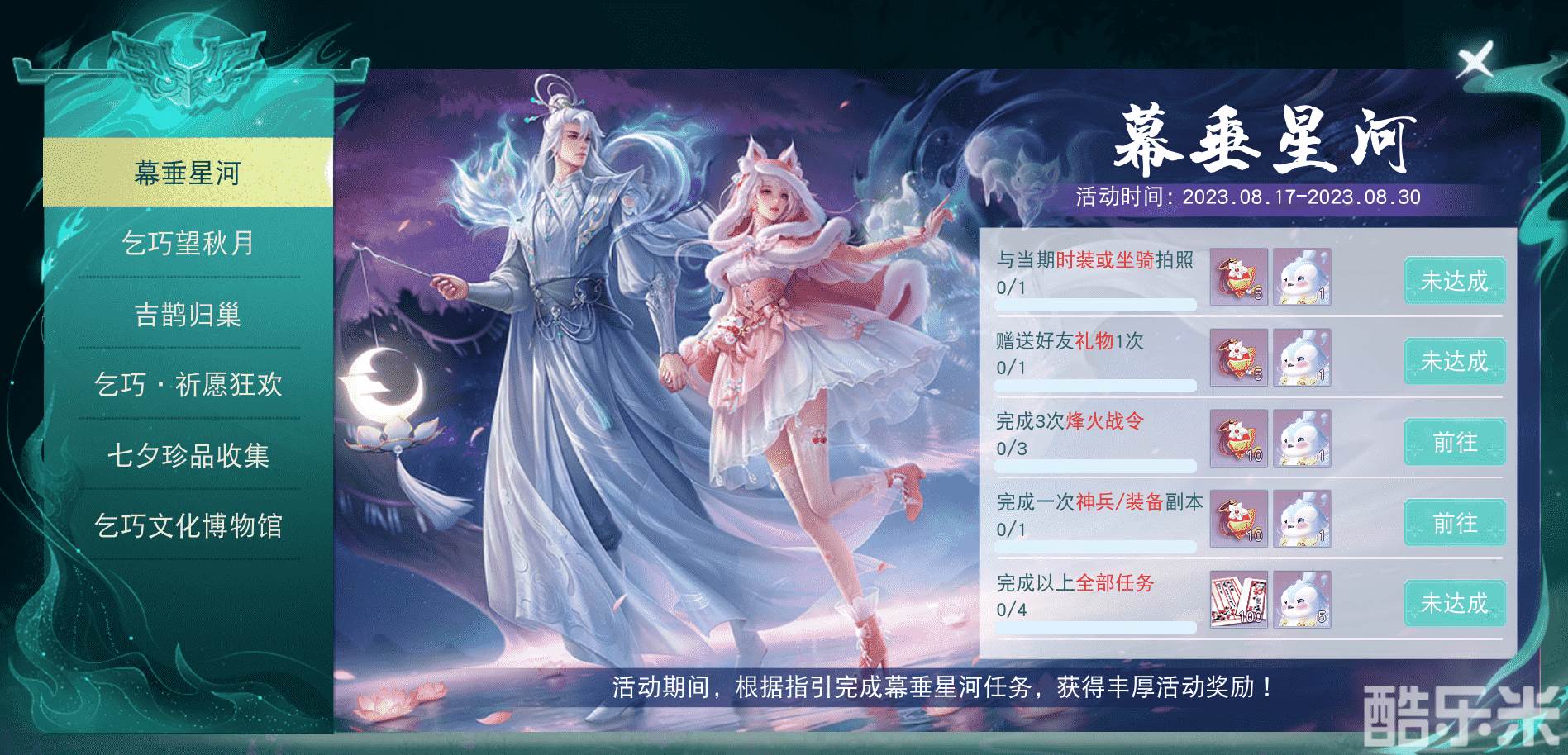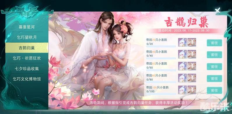 8月17日-8月30日期间,前往乞巧望秋月活动界面,参与以下玩法获得小喜鹊,使用小喜鹊可点亮鹊桥积累进度,达到相应进度后可领取永久称谓、雷音溟钻、四级宝石袋等珍贵道具,奖励超级丰厚,少侠们可别错过啦~