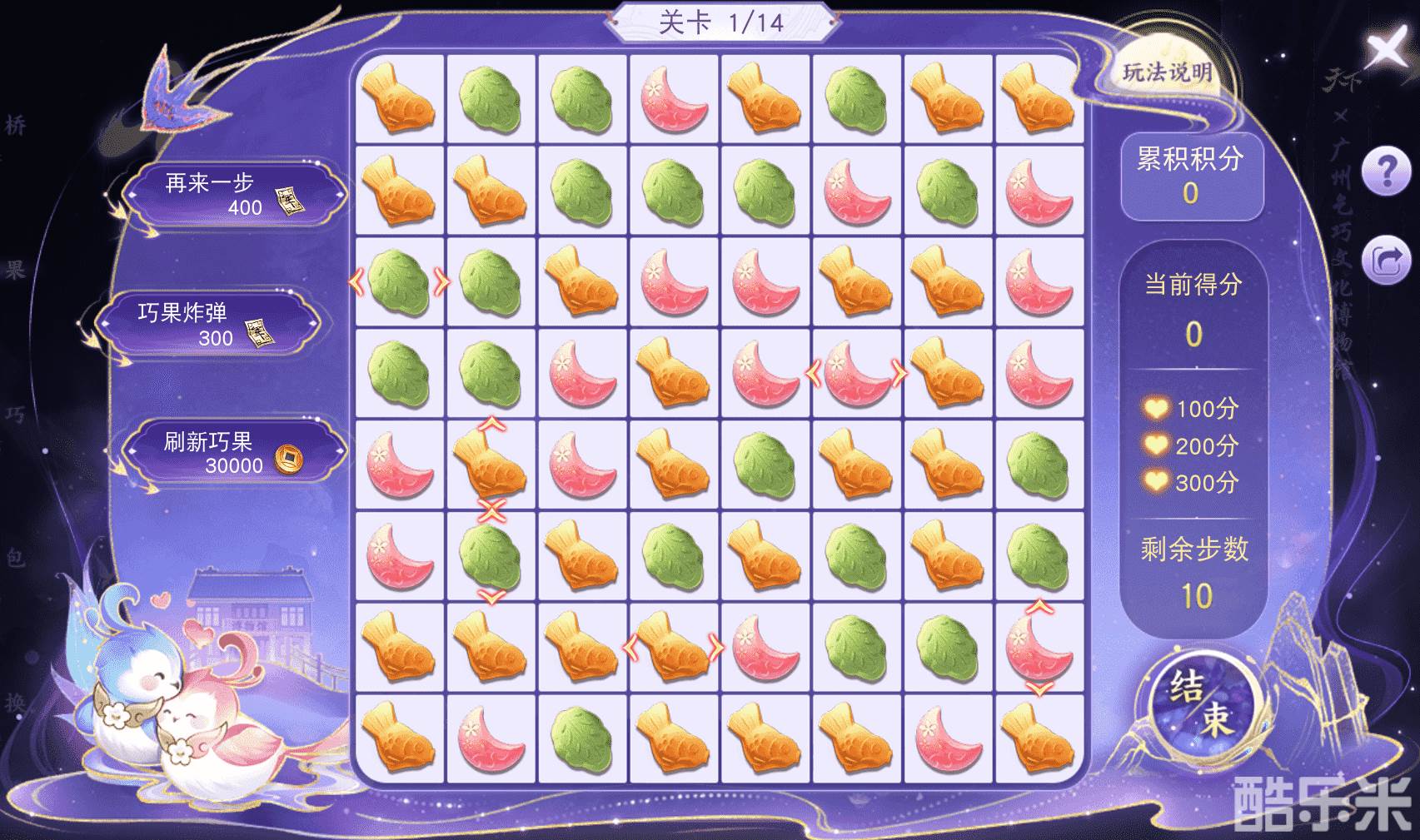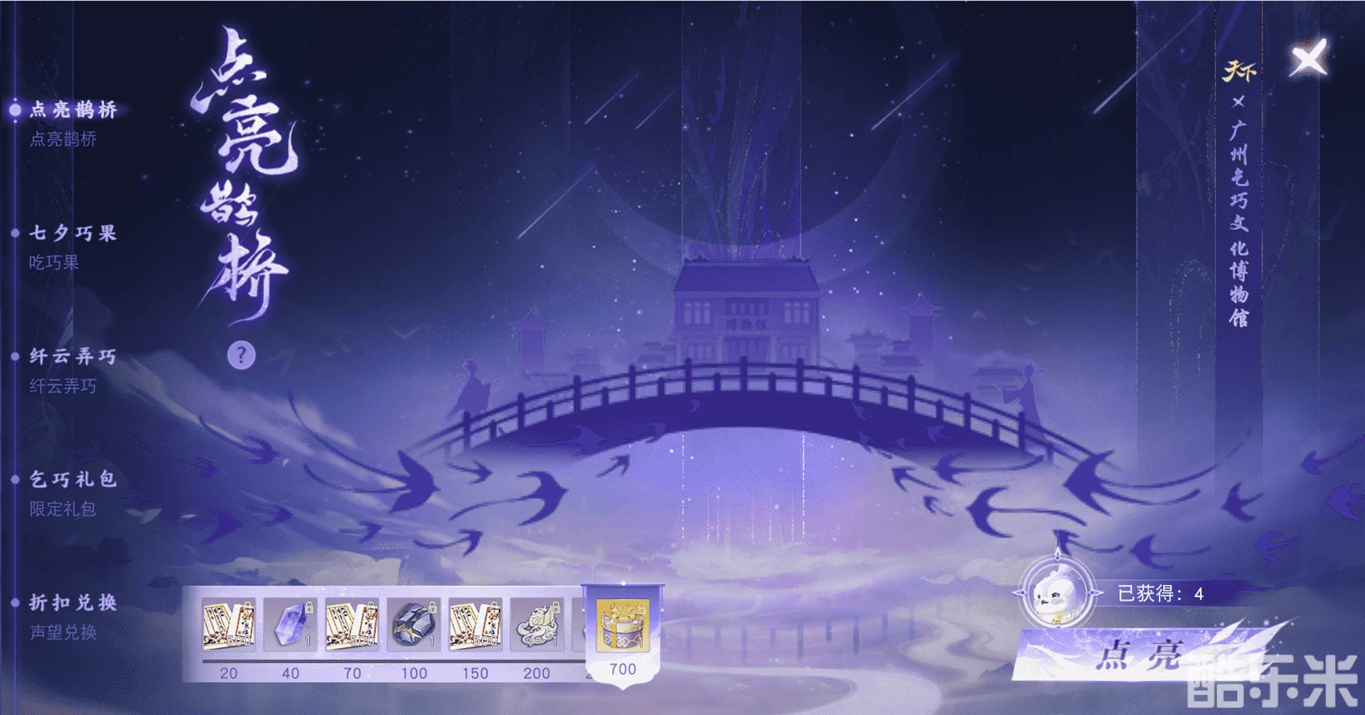 参与七夕巧果玩法,将三个及以上相同颜色的巧果连线消除,可获得积分,达到一定积分便可通关并领取小喜鹊等奖励,收集成就点还可解锁虚灵结晶、虚灵尘埃等奖励。