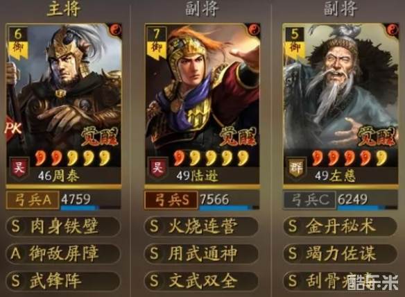很常规的搭配哈,陆逊带上用武给到一个稳定的输出,在配合文武叠加智力,陆逊自带战法发动概率本身也不低,只是相对于带上士别太平少了奇谋和一定规避效果,但是有了左慈的加入也还好,左慈带上竭力加刮骨主打的就是一手解控加治疗,周泰在给到御敌加武锋阵,一定的减伤以及增伤,其实也够了,让周泰来挨打最好不过了。