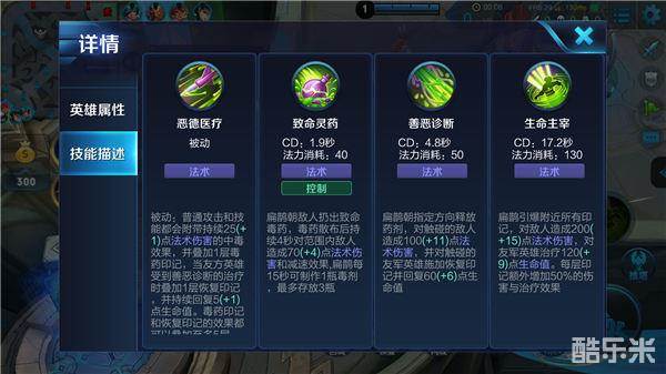 解析:普通攻击和技能都会附带法术伤害的中毒效果,并为敌人叠加1层毒药印记,最多5层。经过10月23日的版本更新,扁鹊也调整了此项被动,叠加毒药印记的持续时长增加到7秒,就是说扁鹊在给敌人身上施加毒药印记之后的7秒内再次释放技能或普攻都可以增加印记层数,如果过了7秒那么就得重新从0层开始叠加。本次调整之后扁鹊就有了更多的技能释放时间了,再也不怕印记中断导致大招的爆发伤害打不出来了,此外恢复印记也有了图标提示。
