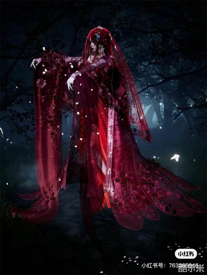 除了这次上线的时装之外,中式恐怖氛围还激起了大家创造的灵感,比如在午夜时分看到这样的场面,幽暗的森林背景搭配暗红的长裙,红色面纱更添诡异之感。