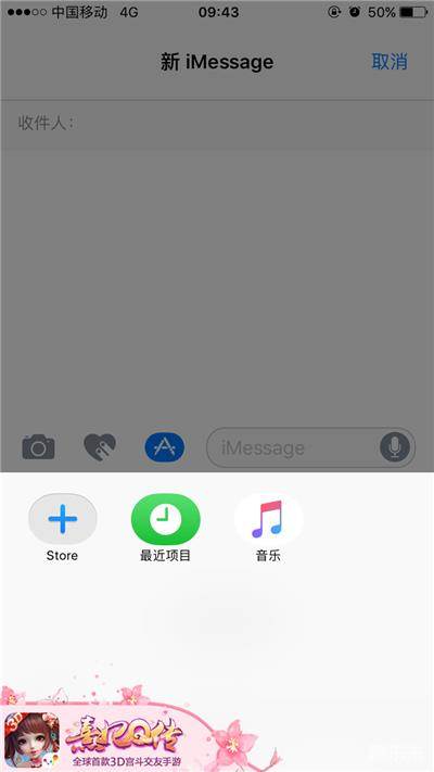 由于此款贴纸只在iMessage App Store上提供,所以小主们要确保自己的设备已经升级到iOS10版本及以上(升级方法:设置-通用-软件更新)。打开“信息”界面,任意选择一位联系人开始编写短信,呼出回复栏,点击输入框左侧的“>”向右拉出菜单,弹出Sticker功能界面。