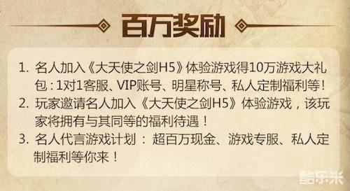 1.名人加入《大天使之剑H5》体验游戏得10万游戏大礼包:1对1客服、VIP账号、明星称号、私人定制福利等!