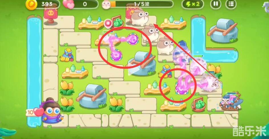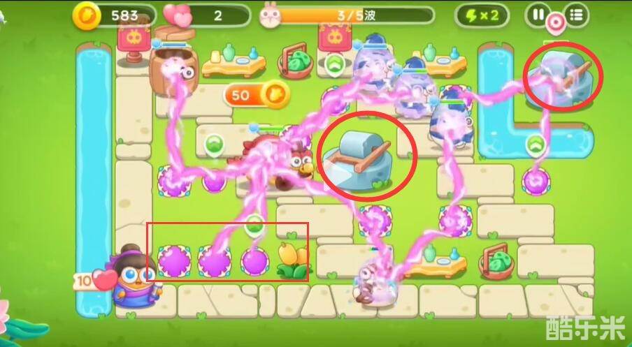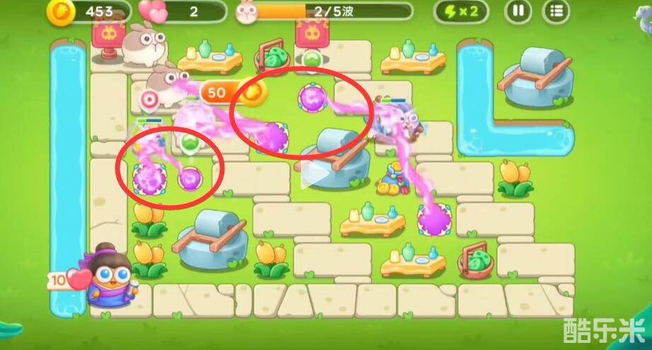1、开局在这里放几个魔法球可以将右边出口的兔子快速的清理。