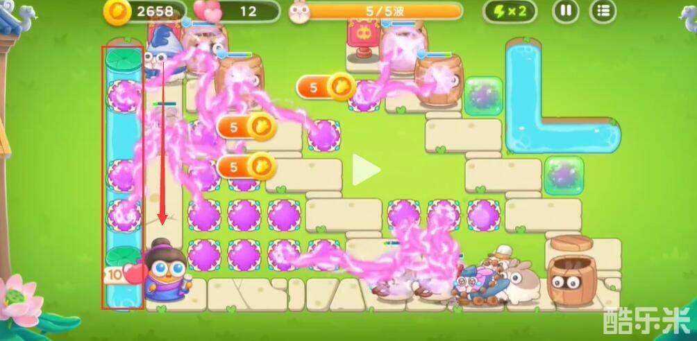 5、第五波时左边的怪会出现,在荷叶上多放置几个就能够进行消灭。