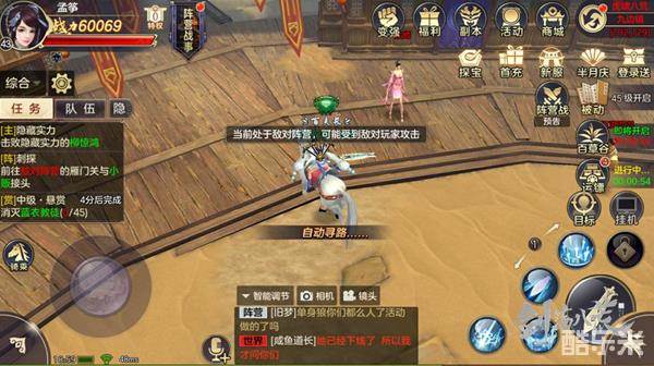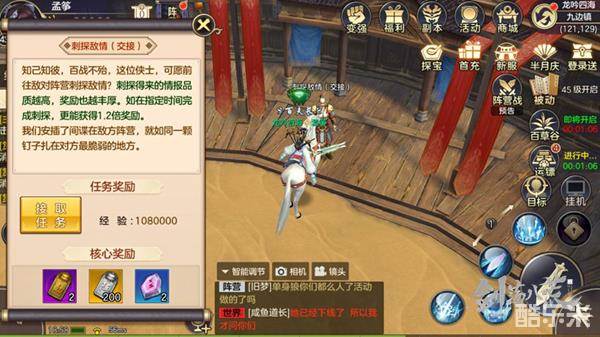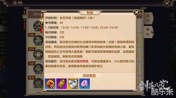 敌国刺探属于高风险高回报的玩法,刺探任务每天可接取两次,可不定时接取,完成任务后可获得大量经验、功勋、银两与强化石,用于强化装备或提升等级。如果在加成时间12:00-14:00;17:00-19:00;和22:00-24:00等三个时段内完成更获得1.2倍奖励。玩家首先需要前往边境的九边镇接取阵营刺探任务,然后抵达任意敌对阵营中的雁门关寻找我方安插的间谍小贩,套取重要情报。由于刺探任务需要深入敌方阵营,玩家在执行任务的时候需要小心敌对阵营玩家的偷袭与伏击,做好随时PK或撤退的准备,必要时候使用隐身符保护自己。