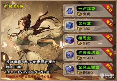 愿天下有情人终成眷属,全新特惠节日礼包活动同步开启。金风玉露盒中将会放置江湖敕令。有需要的侠士可以根据实际情况选择礼包购买~
