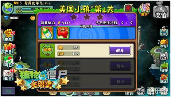 挑战-金盏花、挑战-阳光菇、挑战-元素试炼、挑战-大墓地每日限定参加次数。每次参加会扣除一定的体力。玩家可通过完成上述挑战,获得金币、阳光、元素碎片、装扮碎片作为奖励。挑战-无尽每日限定参加次数。参加挑战-无尽不消耗体力。玩家可通过完成挑战-无尽,获得金币和无尽商店货币作为奖励。