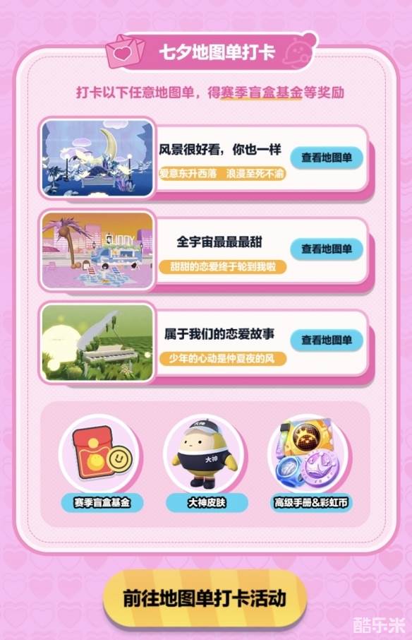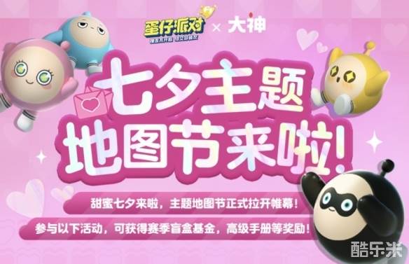 想和蛋搭子来一场甜蜜约会?上大神给TA想要的仪式感!即日起至8月27日,上大神《蛋仔派对》圈子主页参与七夕主题地图节,参与主题地图单的收藏与游玩,即有机会获得赛季盲盒奖金及大神专属外观等丰厚奖励!这个浪漫七夕,与蛋搭子一起打卡超甜的地图,心动值直接拉满,快上大神抱走七夕专属好礼吧~