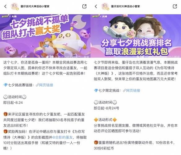 CP滴滴,七夕福利加码派送中!即日起至8月24日,上大神关注“蛋仔派对大神活动小管家”,评论区参与互动即有机会赢取彩虹币、高级手册!在大神站外社交平台晒出七夕挑战赛排名,更有机会赢取奥特曼外观等丰厚奖励噢!双蛋成行不孤单,蛋仔们速来大神寻找意气相投的蛋友!
