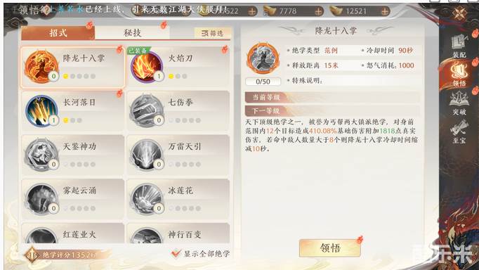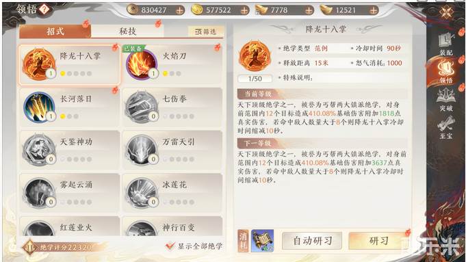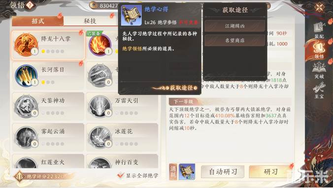 可以通过自动研习快速提升绝学等级,可以预览下一等级绝学效果。