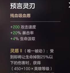 为了提高续航,另外一件预言灵刃也是很重要的,增加攻击速度,暴击率和生命吸取,另外当生命值即将掉到25%以下的时候,将会立即获得护盾,期间生命吸取以及移动速度大幅提升。能够在残血状态下获得护盾,提高了反杀机会。最后可以选择出狂放之击,作为输出神装,如果暴击率达到40%以上则将额外暴击伤害转化为真实伤害,叠加到40%非常简单,前面几件装备就已经够用。