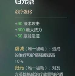鞋子方面其实选择比较灵活,推荐出冷却鞋,这样可以加快节奏,使很多技能使用的更加频繁。第3件选择归元鼎,同样是用于强化治疗,提供的两个被动效果使造成治疗和护盾强度提高,另外对友方英雄释放治疗或者是护盾时,将触发额外效果,降低目标以及自身受到的伤害,提高生存能力。本身也能增加法术攻击和最大法力值以及技能急速。