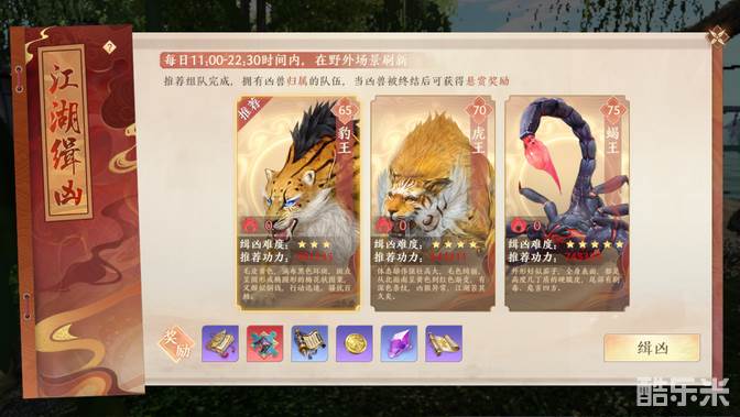点击前往活动后,可以进入活动界面,可以看到凶兽的难度等级,可以点击不同的凶兽查看出现地点,等级越高奖励越好,相应的挑战难度也就越高,更有可能被其他侠士抢去归属权,选择适合自己队伍的凶兽很重要。