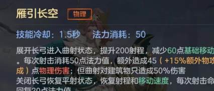 展开长弓进入射击状态,此时提高射程,但降低基础移动速度,每次射击都以消耗法力值为代价,造成额外物理伤害,如果攻击目标是建筑物,则只能发挥出一半效果。点击之后关闭恢复到常规状态,此时射程和移动速度都回到初始数值,每次射击命中后能回复法力值,使用该英雄最主要就是合理开启一技能,既能保证蓝量续航,又能在关键时候打出额外伤害。二技能属于位移效果,向后跳跃向指定方向射击,降低目标移动速度。三技能伤害区域内敌人,命中之后使其暴露视野并标记出来,命中被标记单位将减少该技能冷却时间。