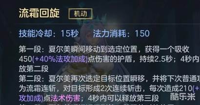 三技能流霜回旋是3段技能:第一段瞬间移动,第二段再次瞬移后再强化普攻,三段归位。在第一段有护盾4秒之后在第二段再瞬移后获得两段强化普攻,然后可以释放第三段回到第一段开始的位置。