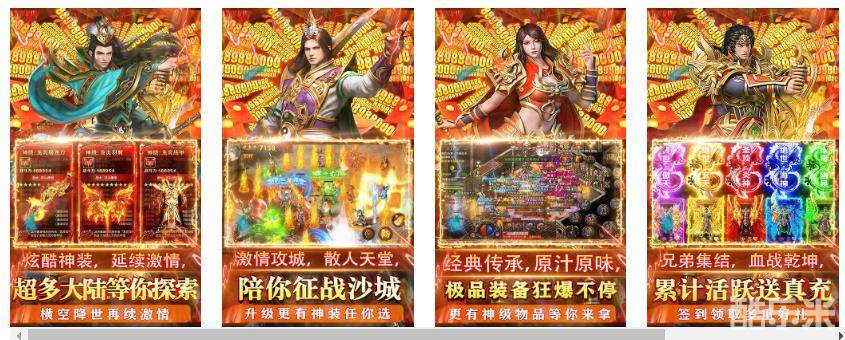 一份输出,多倍伤害,给你绝对畅爽的快节奏体验!更有挂机打金、行会拍卖、皇城争霸、元宝回收等精彩玩法。热血飞舞扬起万千荣光,兄弟聚首再筑传奇神话。让我们一同回到激情飞扬的年代吧!