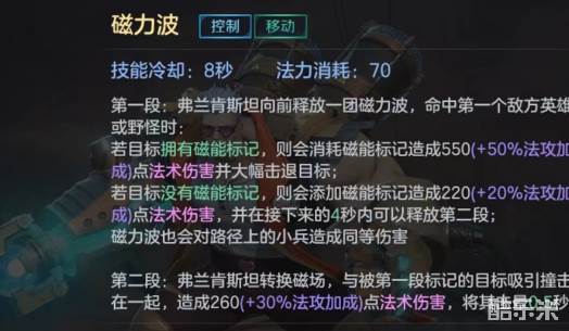 被动技能磁能护盾将自身笼罩在磁能护盾中,最多能叠加到十层,脱离战斗之后会逐渐恢复到三层用来抵挡伤害。每次命中带有磁能标记的目标都会给自身叠加一层护盾。技能磁力波,释放磁力波命中敌方英雄或野怪后进行判定,如果目标身上带有磁能标记,则将标记消耗掉造成额外伤害,并且将目标击退。如果身上没有标记则添加上标记,并在接下来4秒内释放第2段效果。第2段将会转换磁场,与第1段标记目标吸引撞击在一起,将其击晕。