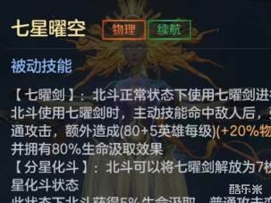 不随形态改变的技能为玉衡闪,属于机动类生存技能,选定方向后突进造成伤害,并且自身获得护盾,拾取飞星之后返回大多数冷却时间。技能天枢解,就是使自身能进入到分星化斗状态,将所有主动技能替换掉,召唤回所有飞星后解除此状态。小编总结一下,在使用中特点就是近战形态下要注意技能之间衔接,不断穿插进强化后普攻是伤害最大化。远程形态下要利用好与利用玉衡闪补充飞星和获得强化。对线期建议先用远程形态,这样可以更方便消耗血量,一旦对方血量过低达到斩杀线就切换成近战形态快速爆发收割。