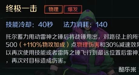托尔的被动技能一旦触发的话,远的目标单位也就是超过3米的目标会扔出雷神之锤造成37物理伤害,如果近的话直接锤子砸下来锤击目标。1技能加持雷神之锤,获得1次强化的普攻。如果下次攻击是远程攻击的话那么雷神之锤会飞出去并给对方造成120点物理伤害,锤子可以捡回来,如果是近攻的话会召唤闪电来进行轰炸,这个轰炸累计185点物伤。3技能的冲刺可以加一个2s时间的护盾,大招蓄力满了之后直接扔锤字,对沿途上的敌人造成500点伤害和30%的减速,再次使用技能召回锤字再次对沿途目标造成伤害。