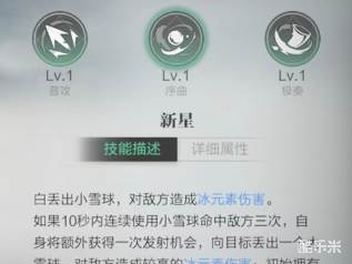 白丢出小雪球,对敌方造成冰元素伤害。如果10秒内连续使用小雪球命中敌方三次,自身将额外获得一次发射机会,向目标丢出一个大雪球,对敌方造成较高的冰元素伤害;初始拥有3枚可丢出的小雪球。