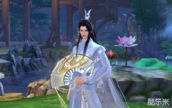少侠用银白发冠将墨色长发束起,额前刘海拨至两鬓随意撒下勾勒出英挺的眉目,更显英俊潇洒。金丝镂空的【烈火荆棘】饰于面部,为他增添了几分神秘优雅。一袭蓝白长衫随风摆动泛起点点荧光,其上云纹刺绣精致细腻,与手中折扇扇面相互映衬,尽显盈盈之姿。