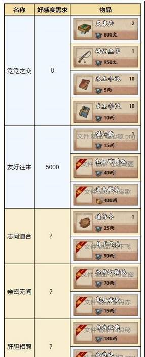 (1)关系为泛泛之交时,需要的物资及贡献:榆木5贡献一份,赤铜1贡献一份,棉花3贡献一份,绿炼石4贡献一份,桦木1贡献一份。
