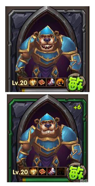所有初始英雄的品质均为白色,当英雄穿齐全身装备后可以升阶,升阶后的英雄品质将提升为绿色(如下图拍拍熊头像外框)。每次升阶,英雄都会提升一个品质,同时每次升阶英雄的全身装备会被吸取掉。