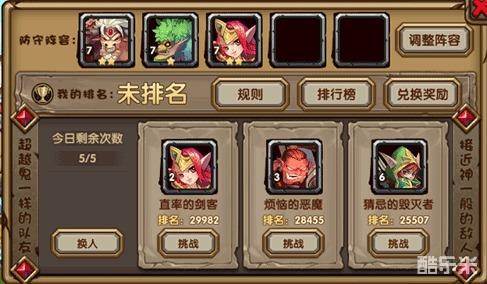 2、有了强力的防守战队保障排名,接下就是如何组建一支敏锐的进攻战队通过挑战快速获得排名提升。这除了一味提升战力外,可以针对对方防守阵容的英雄特点调整我们的阵容以英雄技能相克或速度取胜,还可以进行换人(如对系统提供的3个可挑战的战队不满意),通过换人选择更容易击杀的对手。