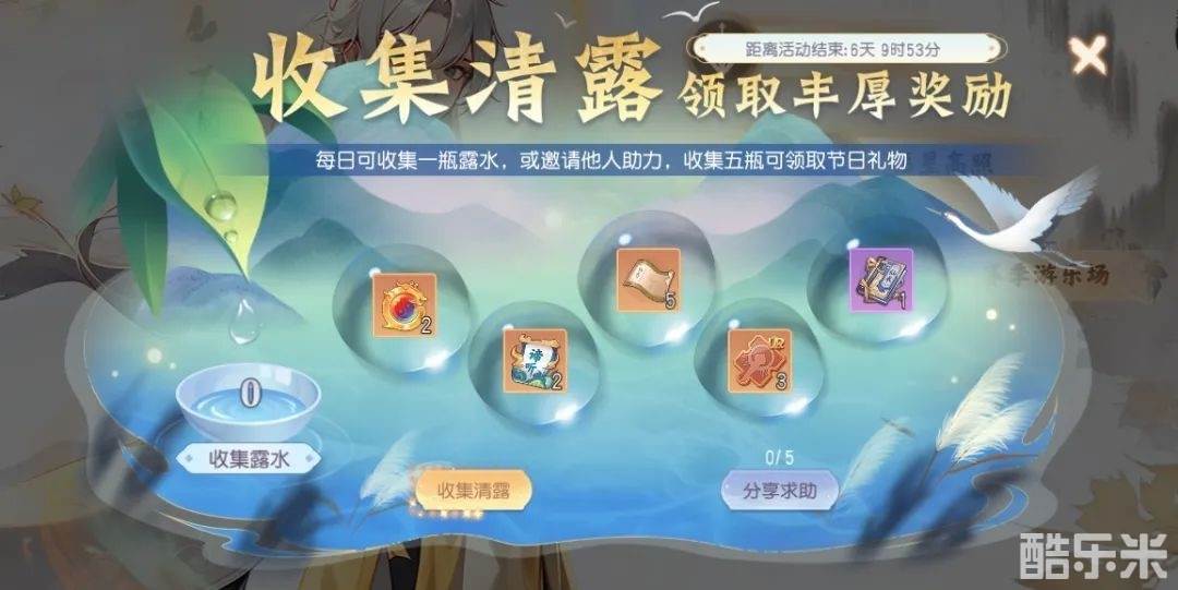 每日可收集一瓶露水,或邀请他人助力,收集五瓶露水可领取节日礼物。