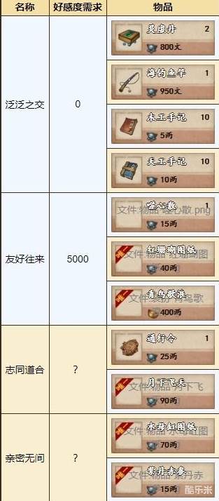 (1)关系为泛泛之交时,需要的物资及贡献:榆木5贡献一份,赤铜1贡献一份,棉花3贡献一份,绿炼石4贡献一份,桦木1贡献一份。