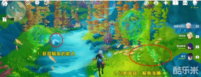 2、玩家前往之后需要获得鳐鱼的能力,然后用此技能将草链切断,随后救出海獭即可完成此任务并获得宝箱。